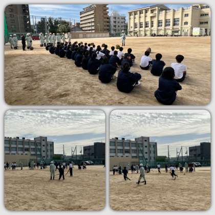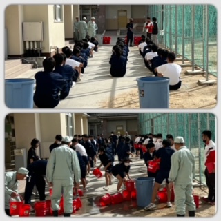 2年生は、ホース延長訓練とバケツ消火訓練に取り組みました☆大災害時には、可搬式ポンプに素早く繋ぐことや消防車の到着を待たずに人力での消火がたくさんの人命を救うことにつながります。生徒たちは、真剣に取り組んでいました♪
