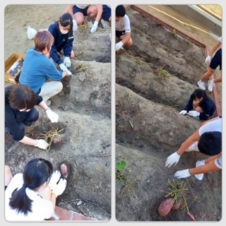 作業学習で2年生が作成した粘土細工と春から育ててきたさつまいもの収穫の様子です☆