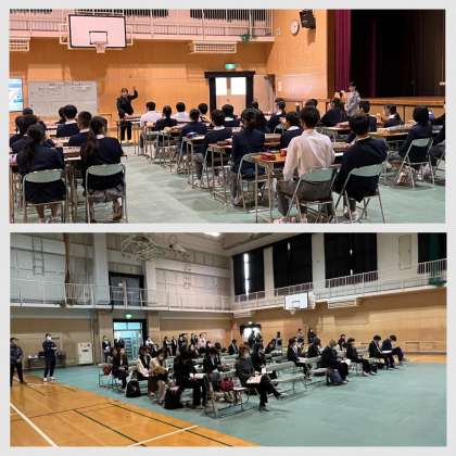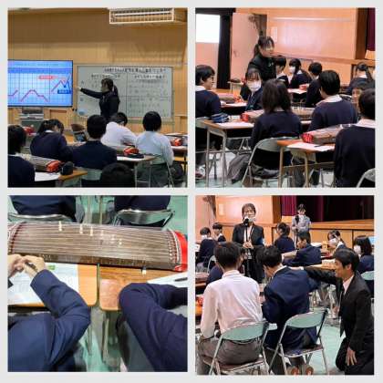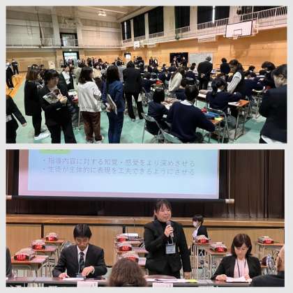近畿音楽教育研究大会大阪大会☆11月10日 公開日 2023/11/10 更新日 2023/11/10 お知らせ 本日は、体育館にて、近畿音楽教育研究大会が行われました☆ 授業のテーマは「俳句を使って歌をつくろう」で、生徒たち一人ひとりが自分の考えをもち、周りの仲間とシェアしたり、新たな疑問を投げかけられたりしながら考えを深めていくスタイルで授業でした。 50名を超える他校の先生方が参観に来られていましたが、生徒たちはいつも通り積極的に取り組んでいました♪ いいね(0)