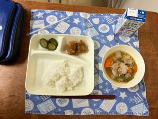 豚肉とじゃがいもの煮もの 米飯 牛乳】
