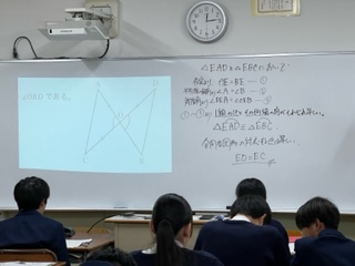 今日の授業☆2年生数学科11月13日 公開日 2023/11/13 更新日 2023/11/13 お知らせ 三角形の合同条件を使った証明問題に取り組みました☆生徒たちは、なぜそうなるのか根拠をもって解答していました。素晴らしい♪ いいね(0)