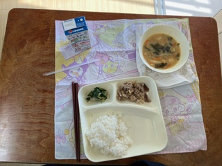 【豚肉のねぎじょうゆ焼き みそ汁 米飯 きくなとはくさいのごま和え 牛乳】
