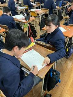 単元「大気とその変化」について、問題プリントを使い、振り返りを行いました☆生徒たちは、周りの仲間と教え合いながら問題を解いていました♪