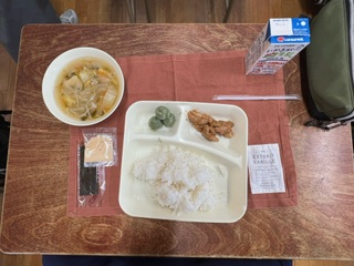 【鶏肉のみそバターソース 五目汁 焼きのり きな粉よもぎ団子 米飯 牛乳】