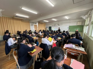 中学校に入学して最初の国語の授業の様子です☆中学校の国語について、授業の受け方や勉強方法などのお話がありました。今日からしっかり頑張っていきましょう♪