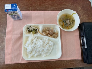 【鶏肉のからあげ 中華スープ 米飯 牛乳
