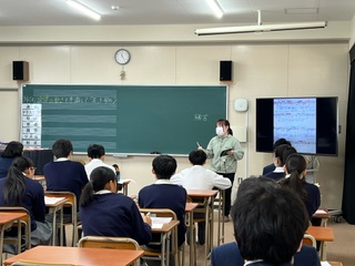 今日の授業☆3年生音楽科5月9日 公開日 2024/05/09 更新日 2024/05/09 お知らせ 滝廉太郎の「花」を学習しました☆ テーマは、歌の旋律の動きを意識して歌おうです。生徒たちは、優しい感じで歌ったり、裏声で歌ったりしていました。写真は、歌ってみた感想を、周りの仲間に説明しているところです♪ いいね(0)