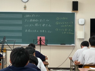 今日の授業☆3年生音楽科5月16日 公開日 2024/05/16 更新日 2024/05/16 お知らせ 滝廉太郎の「花」の歌のテストを実施しました☆ 工夫したところや伝えたいイメージを発表したあと歌いました。周りの生徒は、プリントを使い、他のグループの評価や感想を書きこんでいました♪ いいね(0)