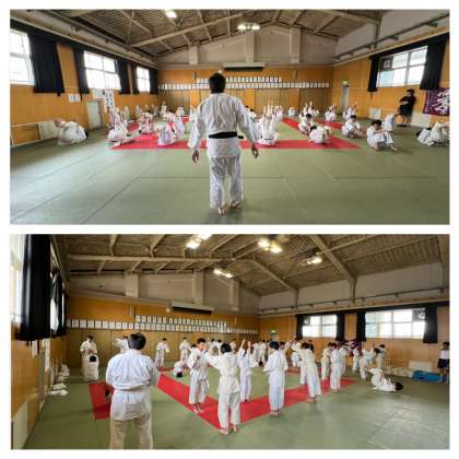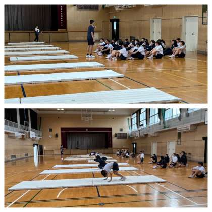 男子は格技室で柔道の受け身を、女子は体育館でマット運動の前転・後転に取り組みました☆