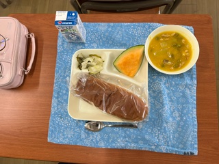 【鶏肉とかぼちゃのシチュー クインシーメロン ミックス海そうのサラダ 加工パン 牛乳】