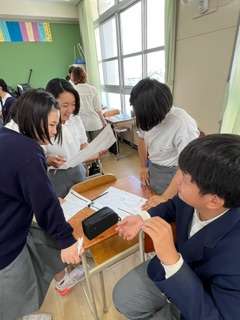 写真は、「make me〜」を使った英文を各自が考え、それを周りの仲間とシェアし合っているところです♪