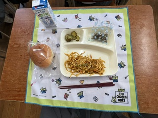 【カレースパゲッティ きゅうりのピクルス ミニフィッシュ コッペパン 牛乳】