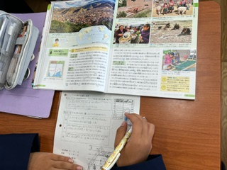 アンデス山脈の位置と自然について学習しました☆写真は、クスコの資料やデータをもとに、その気候や人々の暮らしについて考えているところです♪