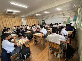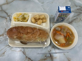 【いかのてんぷら フレッシュトマトのスープ煮 キャベツとコーンのサラダ おさつパン 牛乳】