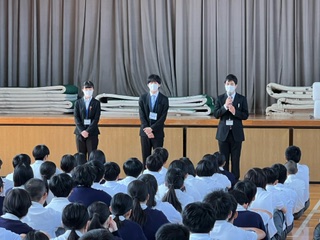 校長先生からは第一印象について話がありました。その後、教育実習生からお礼の言葉、大西先生から文化発表会の出演者募集の話、生徒会からは今週の予定について連絡、がありました♪