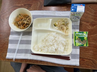 【マーボーはるさめ まっちゃ大豆 米飯 チンゲンサイともやし甘酢和え 牛乳】