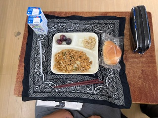【オイスターソース焼きそば コッペパン 牛乳 もやしのしょうがづけ ぶどう】