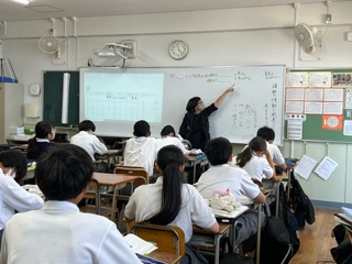 「グラフから読み取れる特徴を一つ挙げ、その理由を考えて説明する」という課題に対する答え方を学習しました☆生徒たちは、「〜という特徴があります。理由は、〜と考えられるからです」というパターン化された形で考えていました♪