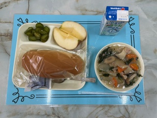 【鶏肉ときのこのシチュー きゅうりのピクルス りんご コッペパン ブルーベリー 牛乳】