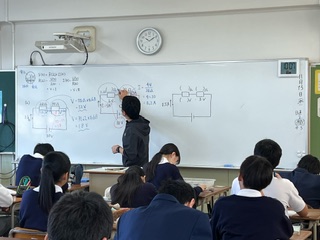 今日の授業☆2年生理科11月13日 公開日 2024/11/13 更新日 2024/11/13 お知らせ さまざまな回路における電流、電圧、抵抗の関係について学習しました☆ 写真は、これまでの内容を振り返るために、問題に挑戦している様子です♪ いいね(0)