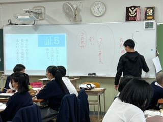 今日の授業☆1年生国語科11月15日 公開日 2024/11/15 更新日 2024/11/15 お知らせ 詩「それだけでいい」の作者に真似て、「人」をテーマにして文章を考えるという課題に取り組みました☆ 生徒たちは、「人」の多面性に焦点を当て、自分のイメージしたことを文章にしていました♪ いいね(0)