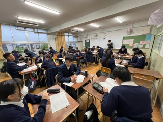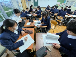 2年生の英語科では、1年生の最初の中間テストに再挑戦し、わからないところを仲間同士で教え合う取り組みを行いました☆過去の問題を解き直すことで、基本的な知識やスキルの定着を図るとともに、新たな気づきや自信につながる効果が期待されます。学び合う姿勢が、さらなる成長の一歩となっています♪