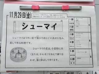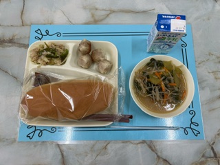 【焼きシューマイ 中華味噌スープ コッペパン ツナと野菜のオイスターソースいため 牛乳】
