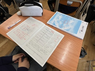 写真は、実像と虚像の作図に取り組んでいるところです。物体から出た3種類の光の道すじを描くことがポイントでしたね。家に帰ってからも練習しておきましょう♪
