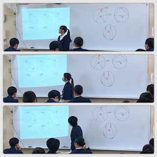 今日の授業☆3年生数学科12月6日 公開日 2024/12/06 更新日 2024/12/06 お知らせ 円周角の学習をしました☆ 生徒たちは、円周角の定理を活用して角度を求める問題や、円周角と弧の関係を利用した問題に積極的に取り組みました。写真は、班の仲間に解き方をわかりやすく説明している様子です。みんなで学び合いながら理解を深めていました♪ いいね(0)