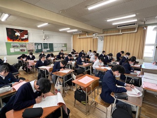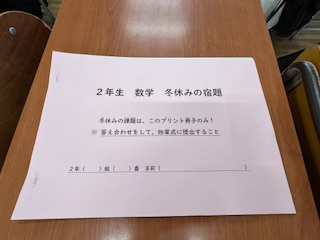 冬休みの宿題が配布されました☆はじめに、宿題の意義や効果的な取り組み方についてレクチャーを受けた後、残りの時間は宿題に取り組む時間となりました。生徒たちは真剣な表情で問題と向き合い、一つひとつ丁寧に解いていました♪