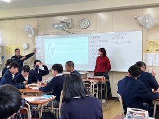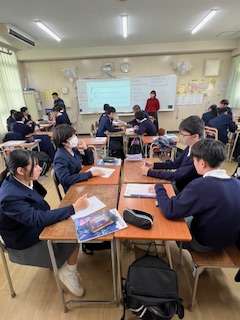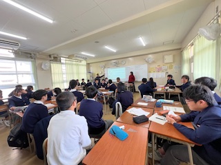 今日の授業☆3年生英語科12月18日 公開日 2024/12/18 更新日 2024/12/18 お知らせ 与えられた4つの英文をもとに、答えを導き出すなぞなぞに取り組みました☆ 生徒たちは、班の仲間と協力しながら議論を重ね、楽しみながら英語の表現や意味を学習していました。 答えを見つけたときの生徒たちの笑顔がとても印象的でした♪ いいね(0)