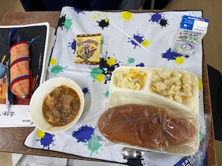 【ビーフシチュー カリフラワーとコーンサラダ カレーフィッシュ 加工パン 牛乳】