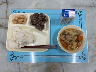 【くじらのたつたあげ 豚肉とじゃがいもの煮物 白花豆の煮物 米飯 牛乳】