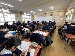 今日の授業☆3年生社会科2月4日 公開日 2025/02/04 更新日 2025/02/04 お知らせ 今週から始まる私学入試に向けて、生徒たちは集中して自学自習に取り組みました☆それぞれが目標に向かって最後の確認を行い、粘り強く努力を重ねています。本番では、これまでの努力の成果を存分に発揮できることを願っています♪ いいね(0)