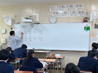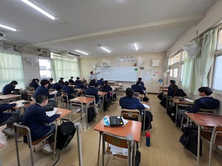 写真は、濃度の異なる食塩水を混ぜたときの食塩水の濃度の求め方について、みんなで考えている様子です。仲間と意見を交わしながら、どのような式を立てれば求められるのかを試行錯誤し、理解を深めていました。これからも、実生活につながる数学の学びを大切にしていきます ♪