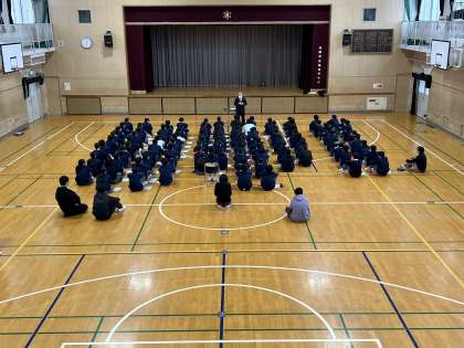 講話では、「働くことの意味」「仕事をするということ」「夢を実現するために今必要なこと」について、具体的な事例を交えながら分かりやすくお話しいただきました。生徒たちは、自分の将来について考えるきっかけを得るとともに、社会で求められる力や仕事のやりがいについて興味を持って真剣に聞いていました。