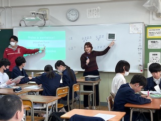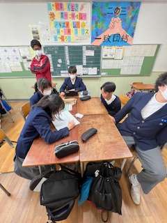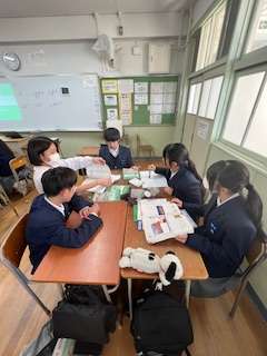 今日は、C-NETの先生とのティームティーチングの時間でした。 写真は、先生から「受動態を使って大阪市の紹介文を英語で作成するように」との指示を受け、班の仲間と協力して取り組んでいる様子です。