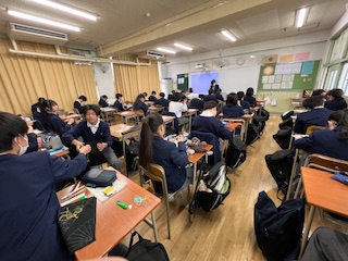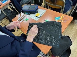 ランチョンマットの製作に取り組みました。写真は、生徒たちが下絵に沿って丁寧に縫い進めている様子です。仕上がりが待ち遠しいですね。