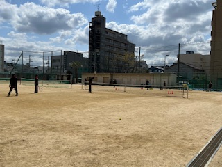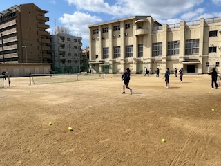 運動場のコートでは、女子公式テニス部が明るく元気な声を響かせながら、活気あふれる練習に取り組んでいます。ラリーやサーブの練習では、一球一球に集中し、仲間同士で励まし合いながら技術を磨いています。