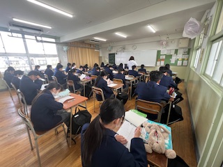 今日の授業☆1年生英語科4月16日 公開日 2025/04/16 更新日 2025/04/16 お知らせ 一般動詞を使ったプリント「すらすら英会話」を活用し、リスニングやスピーキングに繰り返し取り組みました。 会話の練習を通して、英語で伝える力を楽しく身につけています。生徒たちは声を出し合いながら、意欲的に活動していました。 いいね(0)