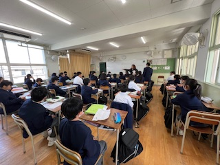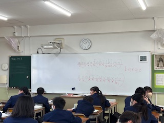 今日の授業☆1年生英語科4月17日 公開日 2025/04/17 更新日 2025/04/17 お知らせ 一般動詞を使った教材「すらすら英会話」を活用し、リスニングとスピーキングの練習に取り組みました。 写真は、ペアで役割を分担しながら、自分たちで英会話を楽しんでいる様子です。 いいね(0)