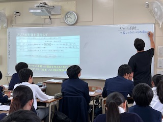 「アジアの列強を目指す日本」の動きを中心に、条約改正やノルマントン号事件など、当時の国際関係と日本の立場について学びました。生徒たちは、時代背景をふまえながら歴史の流れを読み解き、自分なりの視点で考察を深めていました。