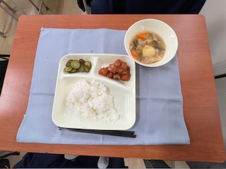 ? 【まぐろのオーロラ煮 豚肉と野菜の煮もの きゅうりの甘酢づけ 米飯 牛乳】