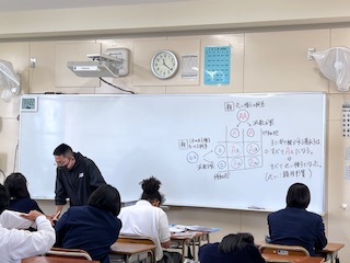 遺伝の規則性について学習しました。写真は、メンデルの遺伝の法則について、資料や図をもとに考察を深めている様子です。生徒たちは、「なぜ子に似るのか」「どのように遺伝するのか」といった問いをもちながら、遺伝のしくみについて意欲的に学んでいました。