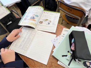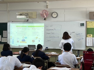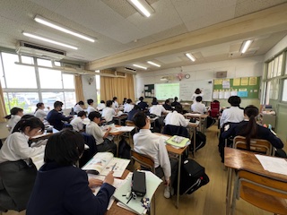 「自分の名前や好きなものを伝えよう」をテーマに学習しました。生徒たちは、発信活動に向けて語彙リストを活用しながら、自分の思いを伝える英文を工夫して作成していました。