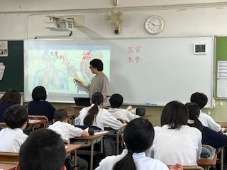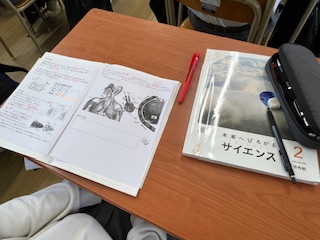 肺がどのようにして空気を取り入れ、体内で気体の交換が行われるのか、その仕組みを配布プリントの図を使って確かめながら、みんなで考えていきました。