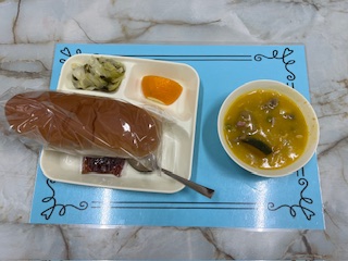 【鶏肉とかぼちゃのシチュー オレンジ ジャム ミックス海藻サラダ コッペパン 牛乳】