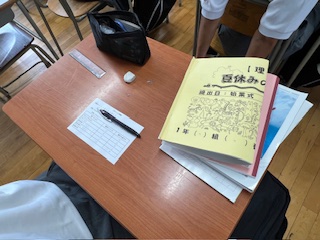夏休みの宿題が配布され、担当の先生から内容についての説明が行われました。その後、前回の学習内容を振り返るための小テストに取り組みました。