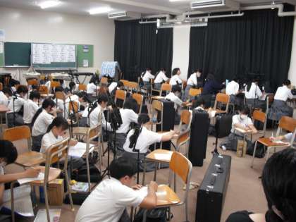 今日の部活動☆吹奏楽部7月31日 公開日 2025/07/31 更新日 2025/07/31 部活動 吹奏楽コンクール地区大会の演奏を全員で振り返りました。 自分たちの演奏をあらためて聴きながら、良かった点や今後修正すべき点について、一人ひとりが感じたことを言葉にまとめました。 写真は、真剣な表情で音と向き合い、次につなげようとする様子です。 いいね(0)