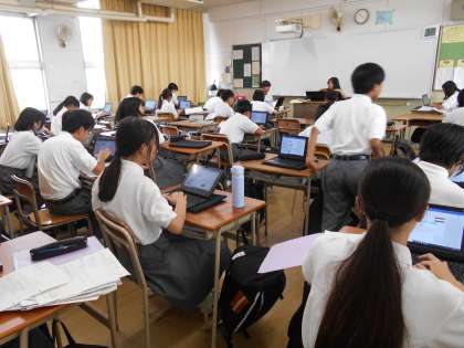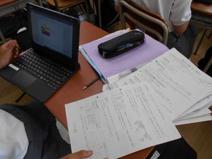 あらかじめくじで決まった国について、タブレット端末を活用し、調べ学習を行いました。生徒たちは地図や様々な資料を参考にしながら、地域の特色を熱心にまとめていました。